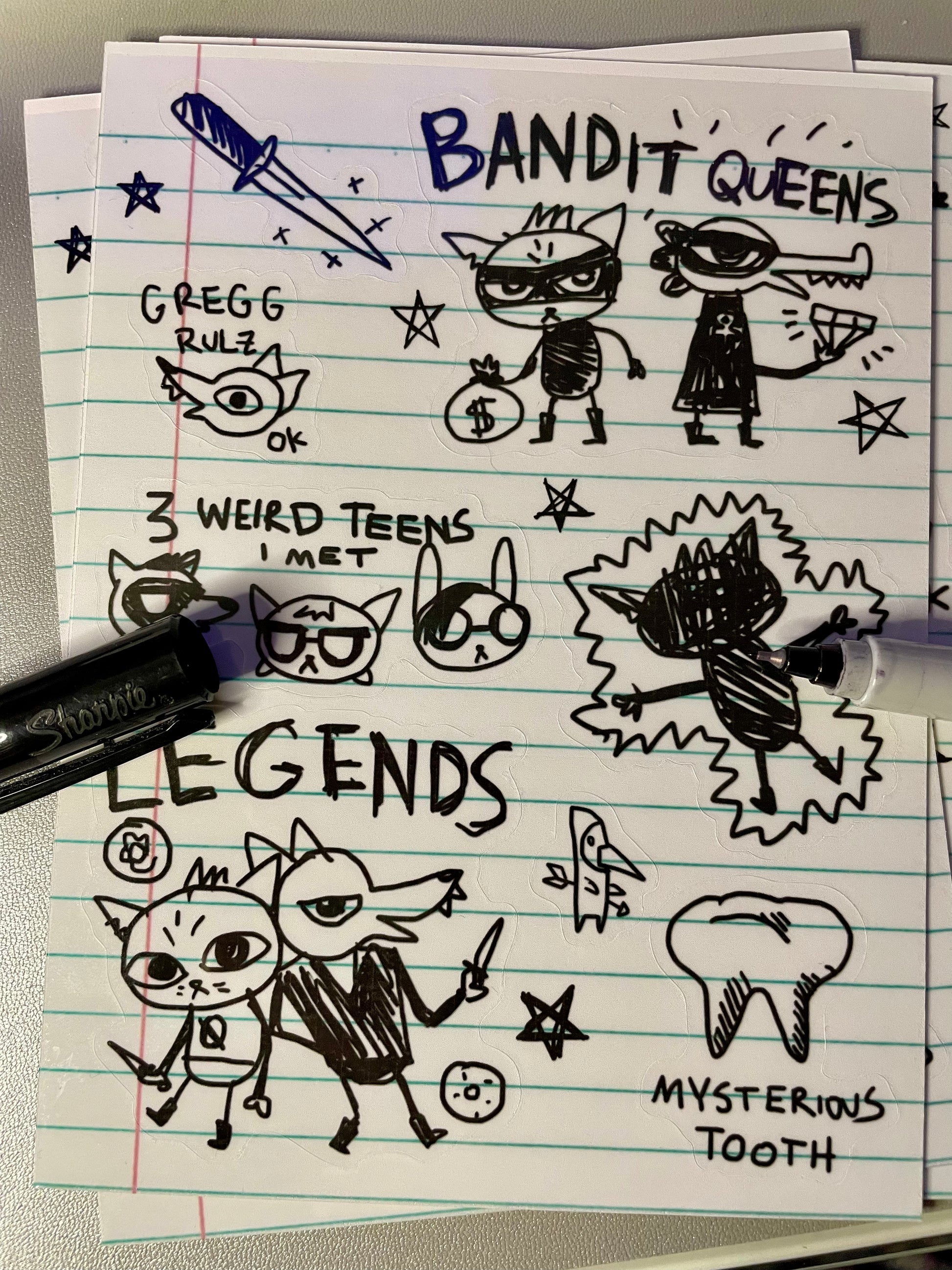 Friendship bracelets are cool, but have you tried crimes? 🔪🦊 This 4.5"x6" sticker sheet brings the scribbly chaos of Mae’s notebook to life—Bandit Queens, legendary duos, and the kind of doodles you’d get detention for.