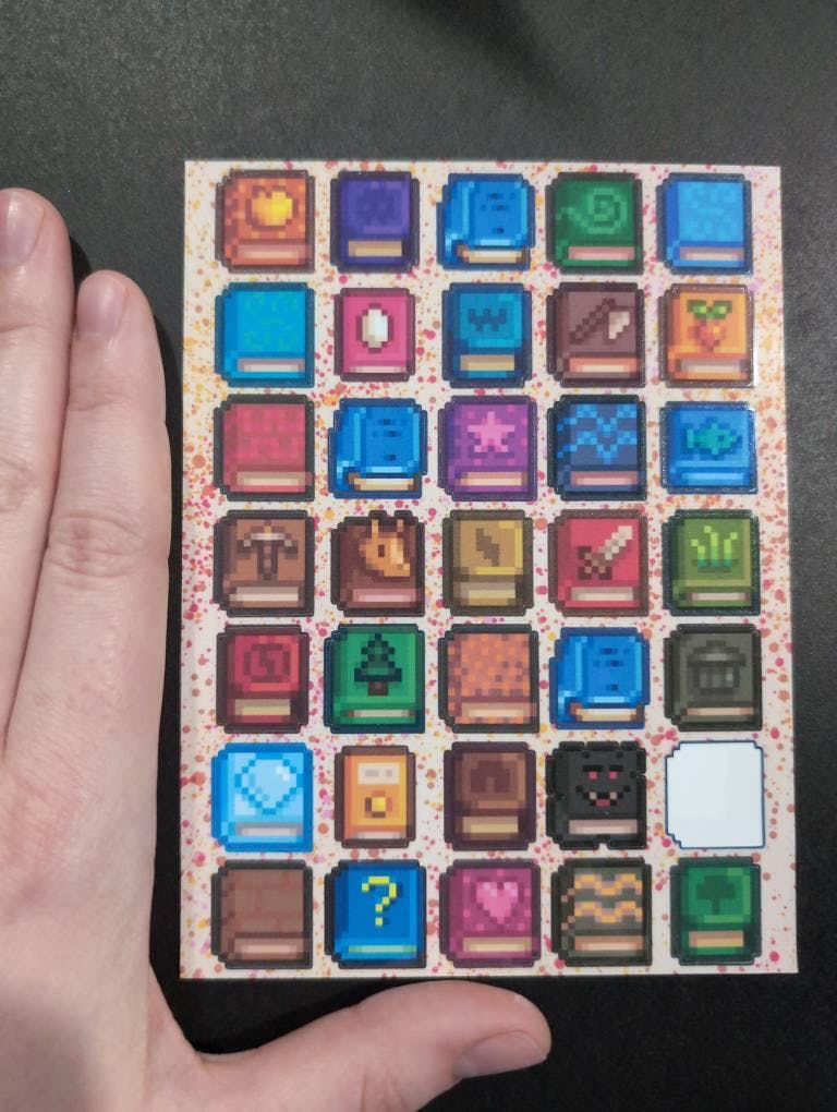 Cracked spines, dusty covers, and wizard secrets—there’s no telling what you’ll find in the Valley’s tiniest library! This sheet is stacked with mini books inspired by every mysterious, nerdy, and adorable volume from Stardew Valley. Ideal for journal pages, planner spreads, or just flexing your love for cozy pixel lore.