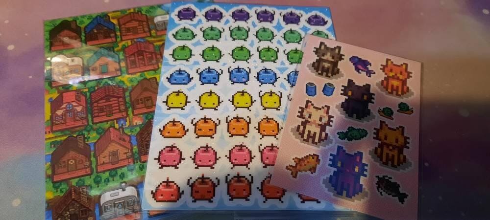 This 4.5"x6" sticker sheet includes 25 adorable Stardew Valley cabins in classic pixel style—every upgrade and variation, plus a few fun extras! Perfect for planners, journals, water bottles, and anywhere else that could use a little farmcore charm.
