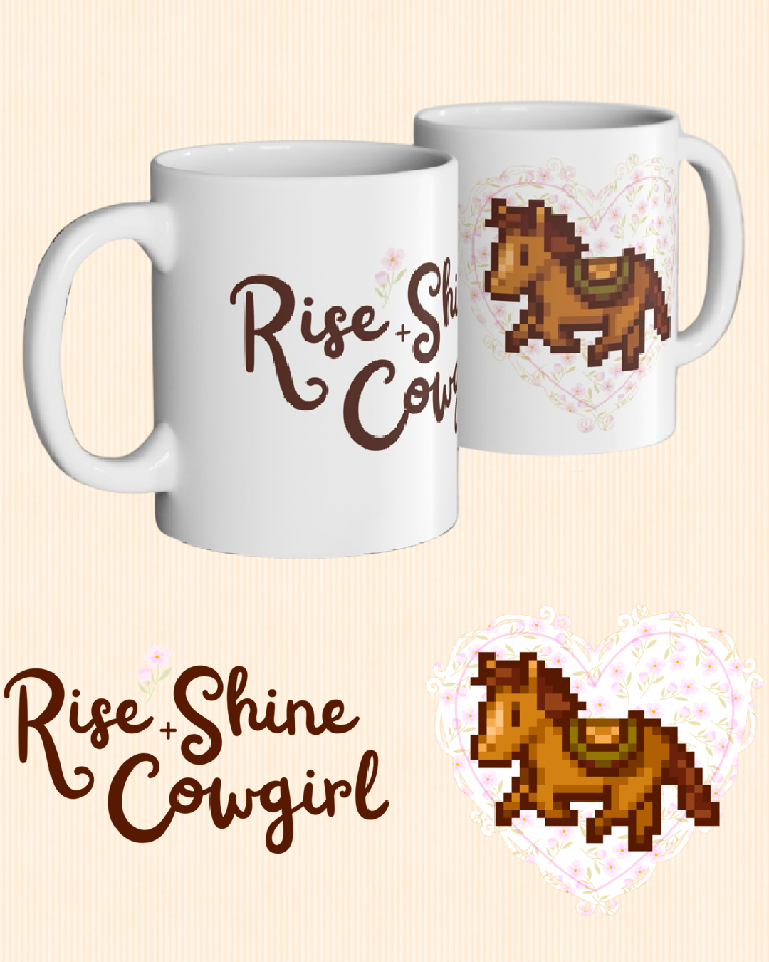 Saddle up for a softer start to your day. 🐎🌸 This Stardew Valley mug features your loyal horse trotting beneath a floral heart on one side, and a sweet “Rise + Shine, Cowgirl” message on the other. With gentle pastel tones and a dash of country charm, it’s perfect for slow mornings, stable chores, or dreaming of pixel pastures.
