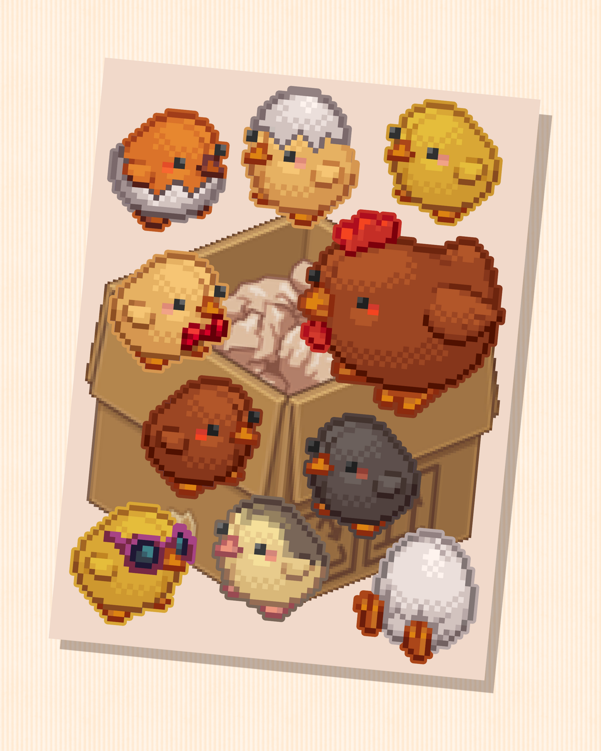 📦🐥 Nothing says “home” like unpacking your favorite feathered family. This 4.5"x6" sticker sheet brings the whole chicken crew from Unpacking—from the proud hen to the tiniest chick—ready to roost wherever you need a little cozy comfort.
